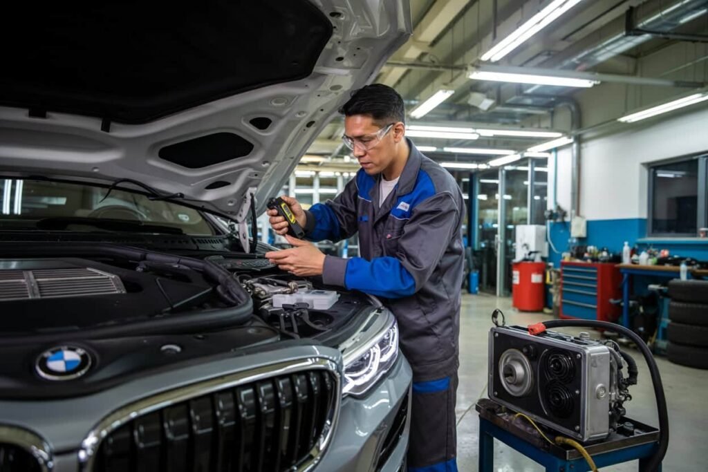 - BMW AC servicing — compressor inspection, gas refill, cooling system flush, and vent performance testing