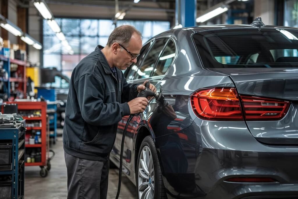 BMW bodyshop service for dent repair, scratch removal, paint correction, and panel alignment restoring factory body finish.